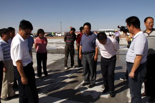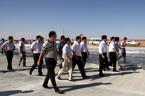 8月21日,由喬新山局長率領的民航西北管理局工作檢查組一行蒞臨金昌機場飛行區(qū)施工現(xiàn)場檢查指導工作。在飛行區(qū)停機坪建設工地,在了解到公司金昌機場項目部僅用了二十五個晝夜完成了總面積2.65萬平方米停機坪道面工程的情況后,對大家的辛勤勞動給予了充分肯定,并鼓勵廣大建設者繼續(xù)鼓足干勁、克服困難,發(fā)揚求真務實、艱苦奮斗的作風,確保工程按期完工。