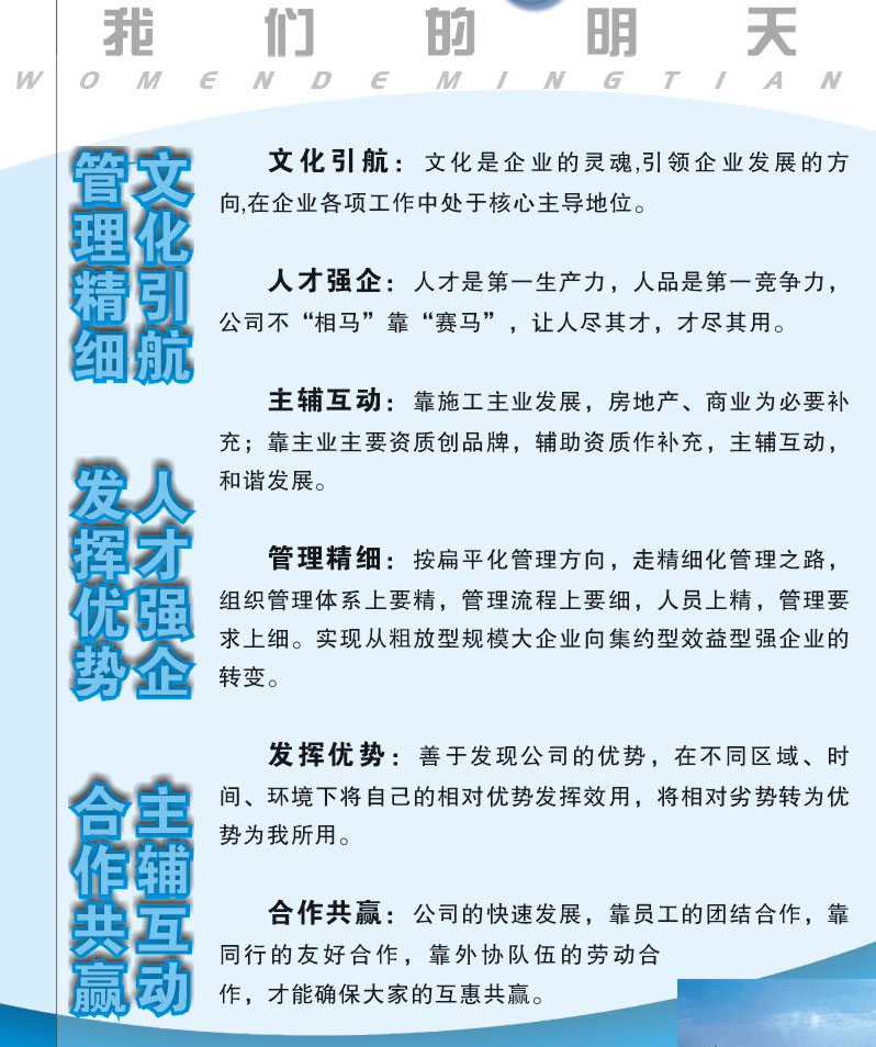 4、企業(yè)文化是企業(yè)發(fā)展戰(zhàn)略規(guī)劃的重要組成部分,公司的發(fā)展戰(zhàn)略是:文化引航、人力強企、主輔互動、精細(xì)管理、發(fā)揮優(yōu)勢、合作共贏。