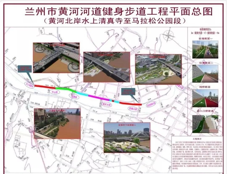 蘭州市黃河河道健身步道工程(黃河北岸水上清真寺至馬拉松公園段)位于黃河北岸河灘,全長2924.317米,西起黃河北岸金城關(guān)古建一條街水上清真寺,沿途經(jīng)過中山橋、元通黃河大橋、羅鍋溝洪道、音樂噴泉廣場、城關(guān)黃河大橋、大砂溝洪道、金雁黃河大橋至馬拉松公園。主要建設(shè)內(nèi)容包括人行步道、健身跑道、棧橋、照明工程、生態(tài)美化工程、相關(guān)配套設(shè)施及中山橋、元通大橋、金雁大橋下和音樂噴泉廣場節(jié)點(diǎn)景觀改造。