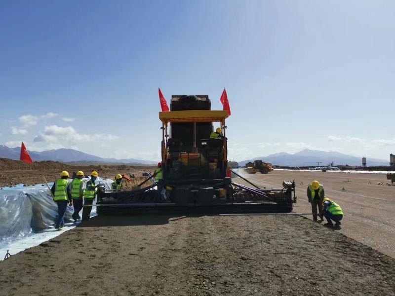 5月28日,伴隨著第一車水泥穩(wěn)定砂礫混合料緩緩倒入攤鋪機料斗,標(biāo)志著由我司承建的新疆和靜(巴音布魯克)機場飛行區(qū)跑道水穩(wěn)基層試驗段施工正式拉開序幕。