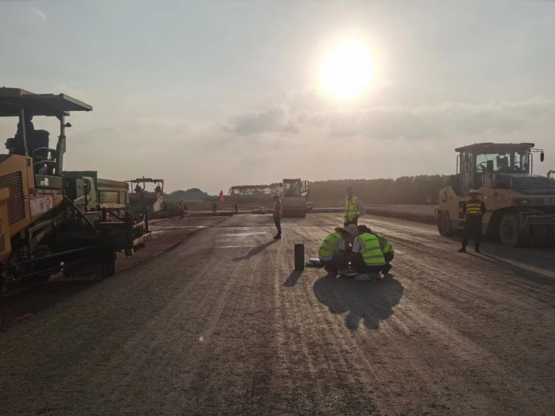 為確保試驗段攤鋪設(shè)備工作高質(zhì)、高效進(jìn)行,項目部統(tǒng)一部署,各部門相互配合,認(rèn)真進(jìn)行施工前各項準(zhǔn)備工作,提前對有關(guān)人員進(jìn)行安全培訓(xùn)和技術(shù)交底。施工現(xiàn)場井然有序,項目負(fù)責(zé)人嚴(yán)格把控運輸、攤鋪、碾壓、檢測等各施工環(huán)節(jié),保證施工質(zhì)量與安全,同時對試驗段標(biāo)高、壓實度、平整度和厚度等各項指標(biāo)進(jìn)行實時檢測并記錄,確保各項指標(biāo)符合技術(shù)規(guī)范要求,并確定水穩(wěn)層松鋪系數(shù)、壓路機(jī)最佳碾壓遍數(shù)及速率,最終達(dá)到預(yù)期試驗效果。